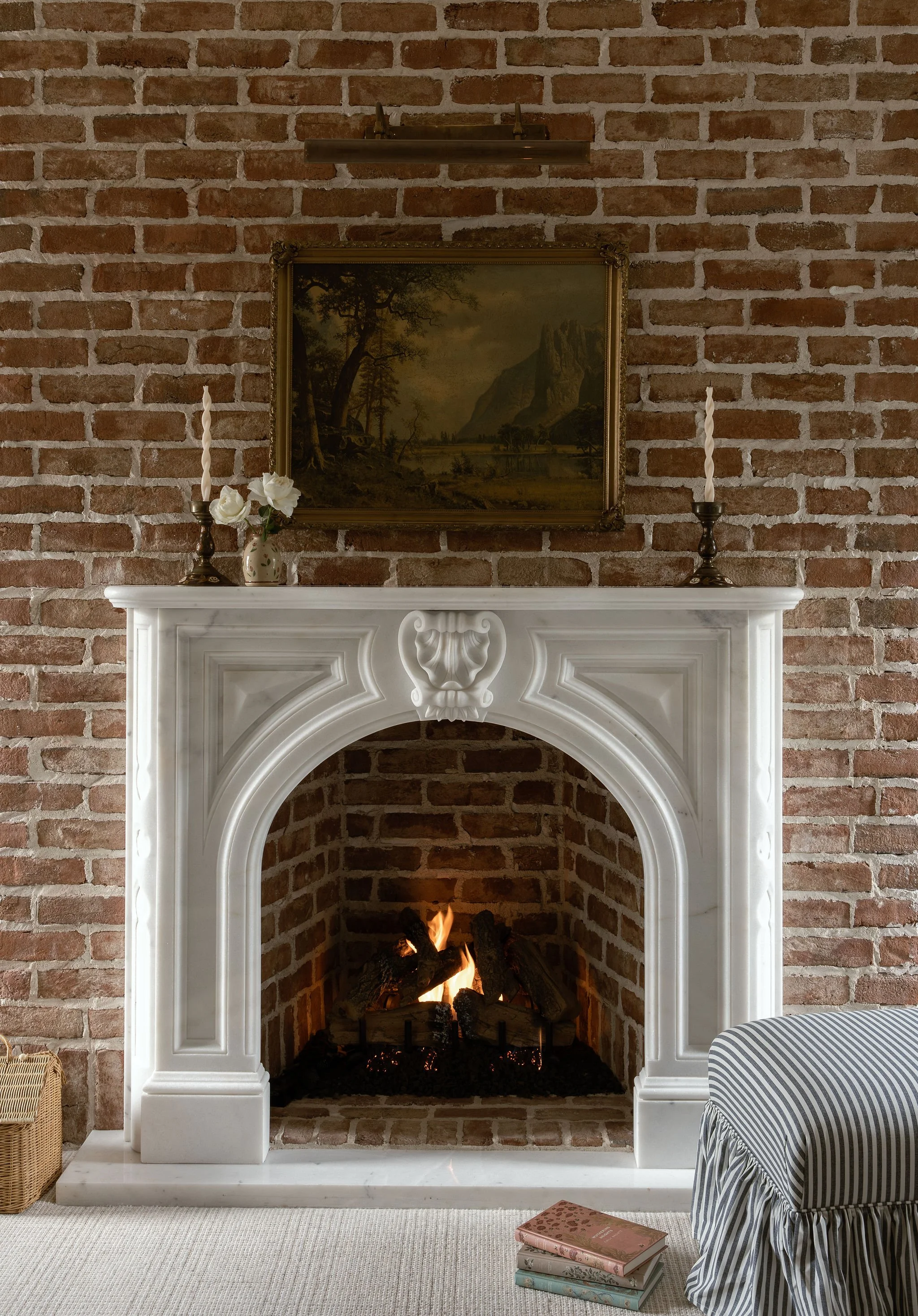 As you step into the girls’ bedroom, the marble-and-brick fireplace instantly sets a warm, inviting tone.