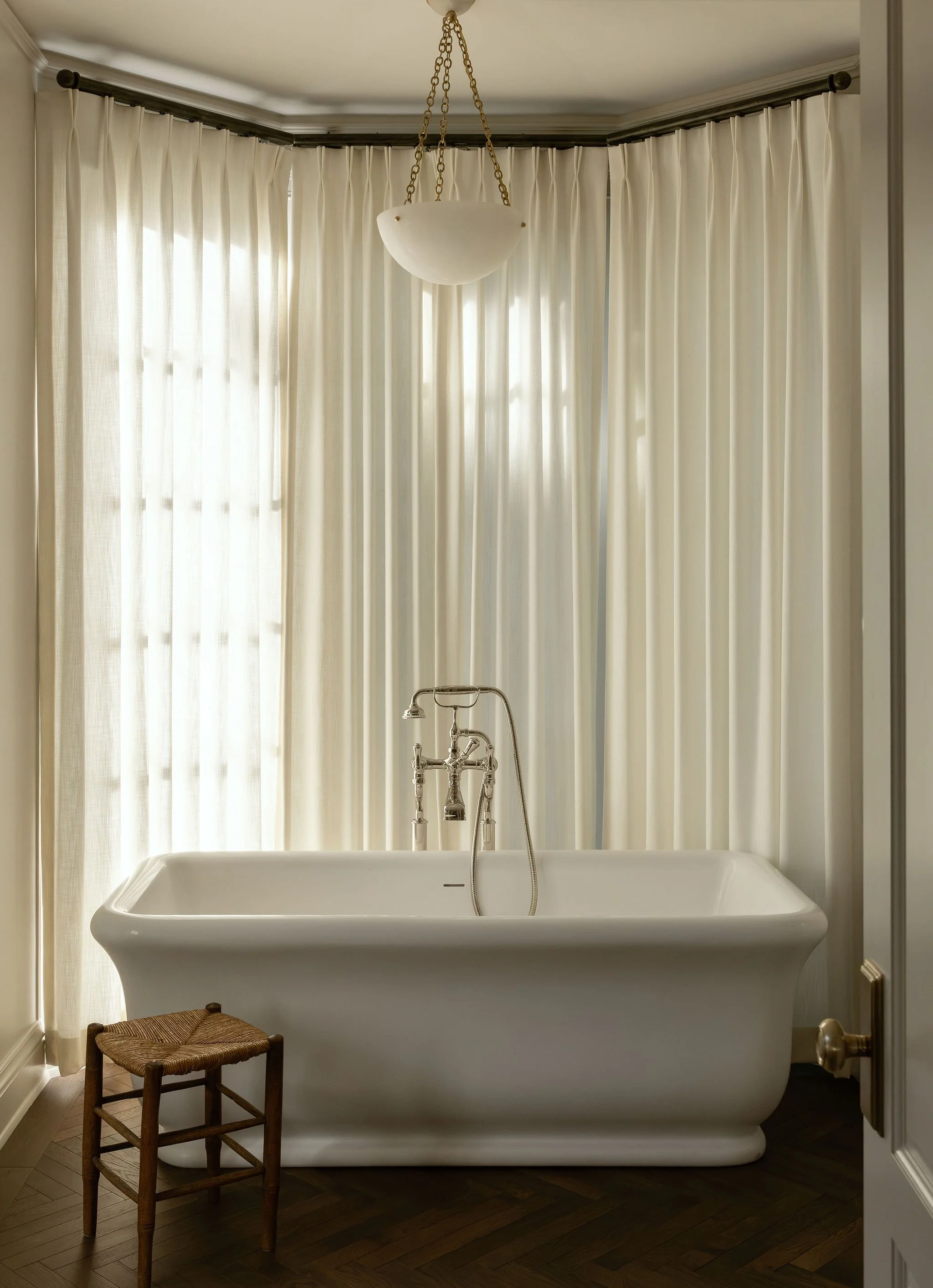 The window treatments make all the difference in this bathroom, giving the space an upscale, elegant feel while providing plenty of privacy.