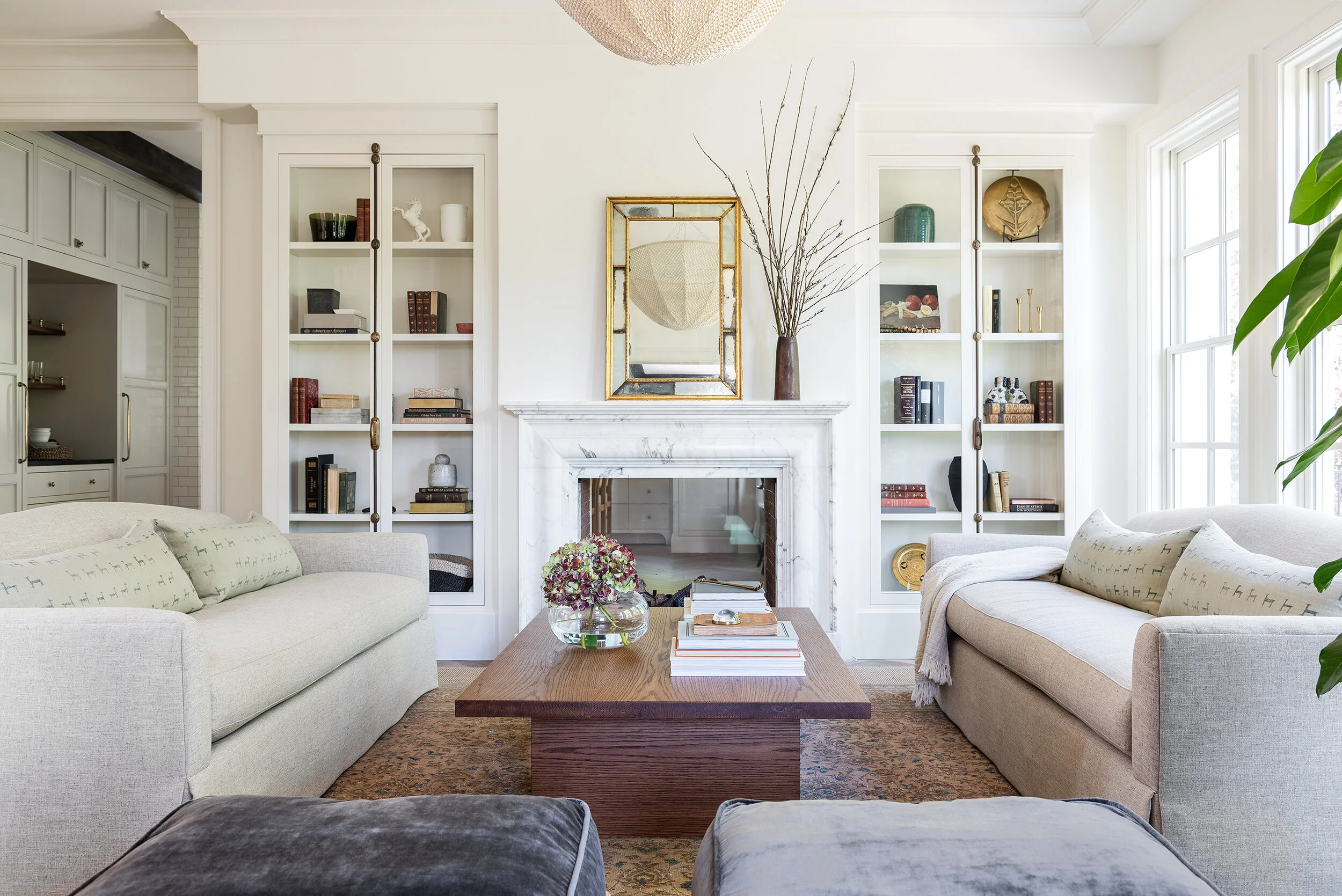 As far as the design of the room goes, I think that what makes this room special are the custom features that we included. In all of our projects, we work hard to include custom design flourishes and furniture, and it really does make a room feel really special. One of my favorite pieces in the room is the fireplace mantle, which was hand cut by Traditional Stonework. It’s a statuary marble, and it is absolutely beautiful. Plus, it’s completely fireproof, so even if my entire house burns down, the mantle will still be standing!