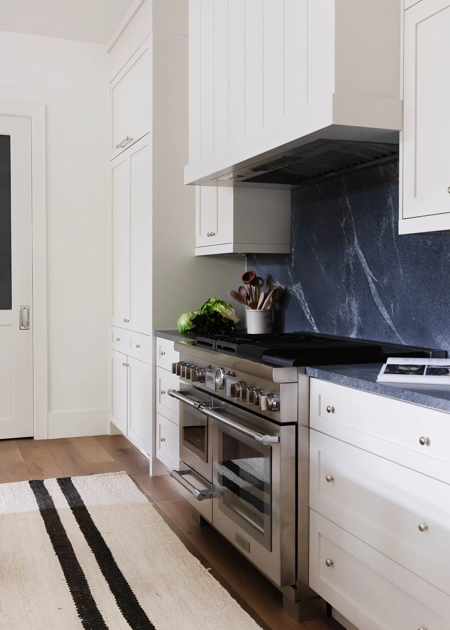 We specified full-overlay cabinetry with a v-groove detail to make the utilitarian space feel special. It’s the perfect spot for winter coats, shoes, backpacks and anything else brought in from the garage to be neatly stored away.